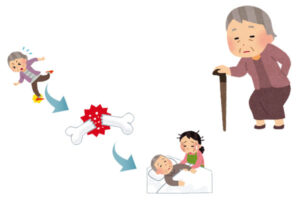 骨折しても若いころは治りやすいですが、年を取ると手術が必要になったり、骨折がきっかけで寝たきりになってしまうこともあります。